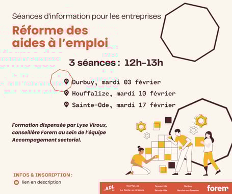 Afin de proposer aux entreprises une information de qualité, les ADL de Tenneville et Sainte-Ode, Marche-en-Famenne, Durbuy et Houffalize - La Roche s'associent au Forem dans l'organisation de trois séances d'information toutes sur le temps de midi.